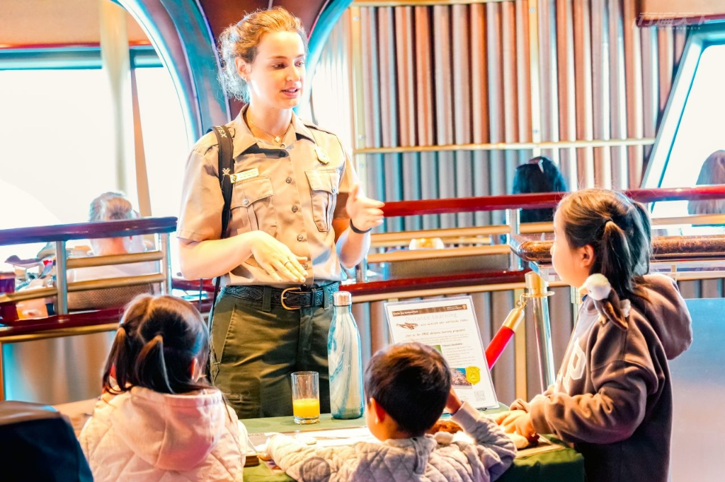 此行最令人期待的,是郵輪穿越冰河灣國家公園(Glacier Bay National Park)與學院冰河國家公園(College Fjords National Park)的兩日航程。兩地由美國國家公園管理局NPS監管,每日僅准兩艘郵輪入內,藍寶石公主號便是其一。抵達前,我們早早在陽台等待,遠方冰河群自霧氣與山影間浮現,冰川崩落如電影場景,正如Debbie Miller筆下「活的冰河」,相當震撼。隨後,護林員乘小艇登船解說,並在16樓設立限量商品區與發放兒童專屬的國家公園活動本,介紹冰川的形成與融解、海獺、海豹等動物的生態知識,完成活動後,還會為小孩舉辦頒獎儀式及勳章,非常用心。