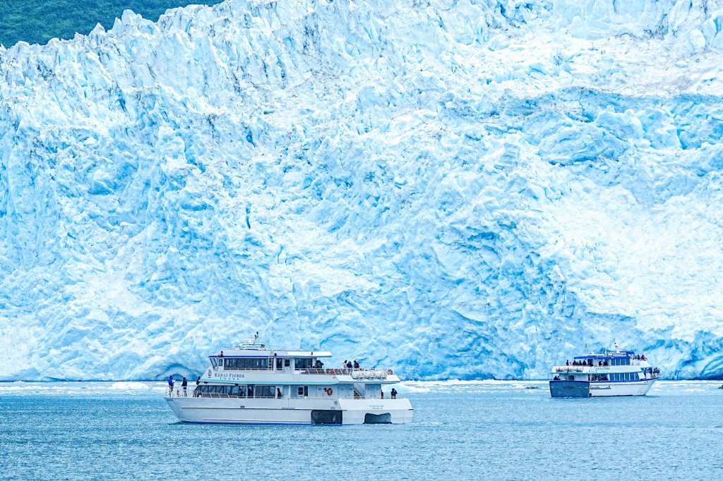 隨後前往峽灣國家公園旁的漁港城市西沃爾(Seward),我們參加了戶外行程裡最熱門的冰川賞鯨船,航行經過開放海域的小島群,正是鮮豔亮麗的冠海鸚/角海鸚與白頭海雕的棲息地,最後抵達霍爾蓋特冰川(Holgate Glacier),由於船身較小,能以更近距離欣賞冰川之牆。過程中不僅有座頭鯨與白腰鼠海豚(Dall’s Porpoise)伴游,解說員也引導遊客觀察海獺、海鳥、座頭鯨與浮冰之間的互動。當賞鯨船駛近巨大裂縫中的冰川牆面時,船長撈起一顆浮冰讓全船品嚐特別的萬年冰川水,也讓人直面在全球暖化下冰川正在迅速崩落退縮的危機。