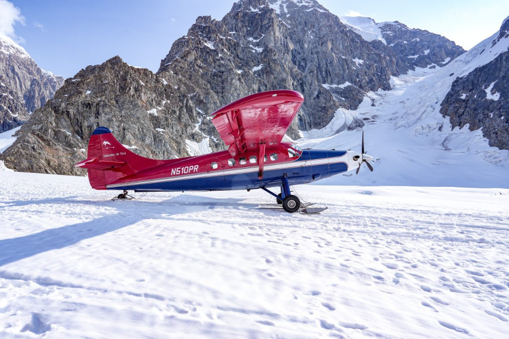 轉往童話般的小鎮塔奇特納(Talkeetna),在這裡我們展開了此行最震撼的一段旅程:Air Taxi飛行之旅。由於塔其特納位於較內陸,氣候相對穩定,且單程飛行時間只有短暫的30分鐘,相較於冰川下游冰面的溼滑難行,上游漫步時腳下雪地鬆軟,因此行程無年齡與體力限制,適合小孩及長輩參加。帶著興奮的心情搭乘小型飛機盤旋上空,遨遊雲之上,眼前浮現的是北美第一高峰的迪納利山脈,這是我們第一次看見山峰與雲海如此連綿壯麗,無邊無際,低頭更隨處可見「冰川之淚」的美麗景色。當飛機降落在冰川發源地,全家人穿上雪靴,步行在冰川雪道與山間,孩子們興奮地觀察四周,更嚐了一口略帶鹹味的萬年冰川之雪,我很推薦主動爭取去程的副駕駛座位置,更能由遠而近飽覽多角度的雲海。