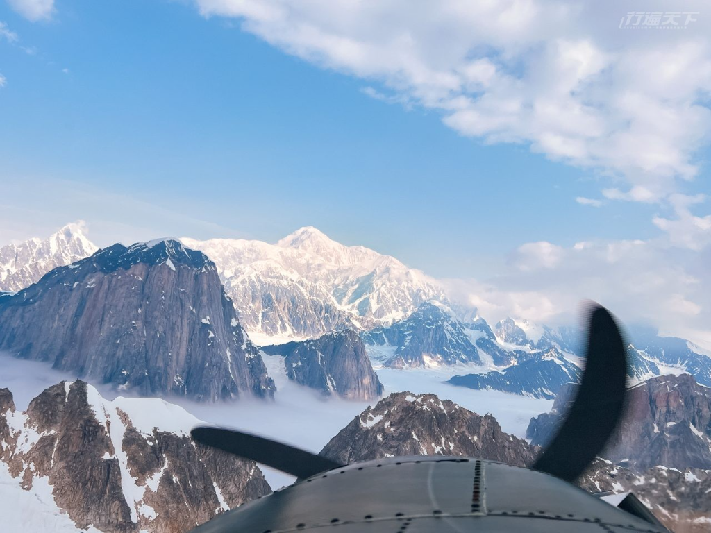 ▲ 小飛機副駕視角遠望,迪納利山脈聳立雲端,蒼茫壯景撼動心靈。