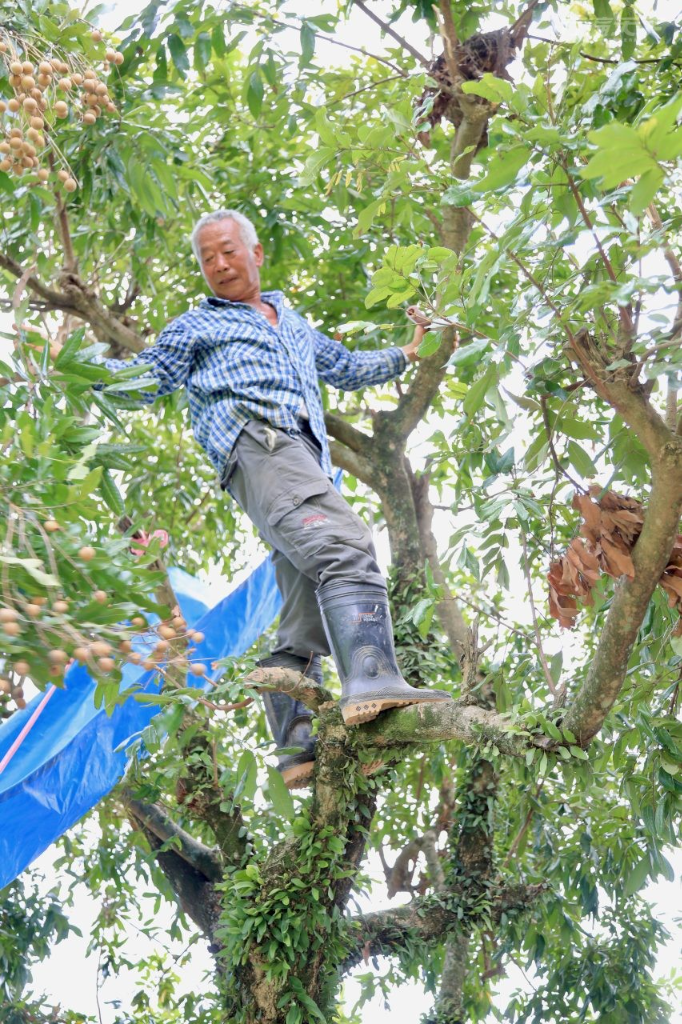 ▲ 仙湖農場第五代主人吳森富正示範龍眼農採收龍眼的方式,作法是把整枝條砍下後順著帆布滑梯滑到地面。