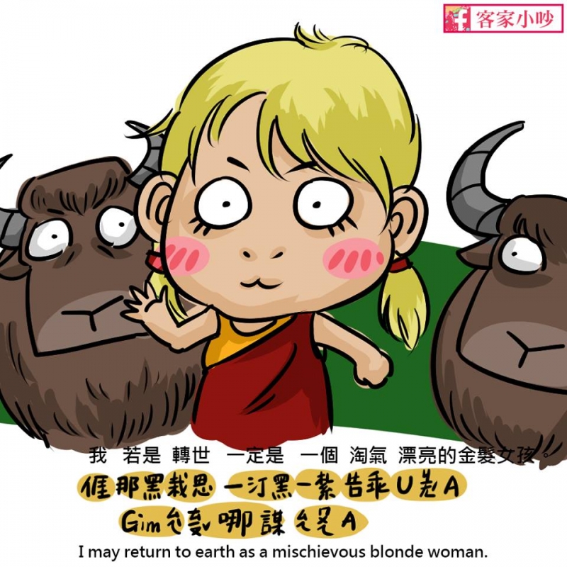 客語原文:我若係再世,一定係一隻搞怪又靚的金色頭那毛細妹仔。