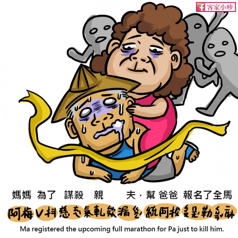 客語原文:阿姆為著㓾忒自家个老公,同阿爸報名了全馬