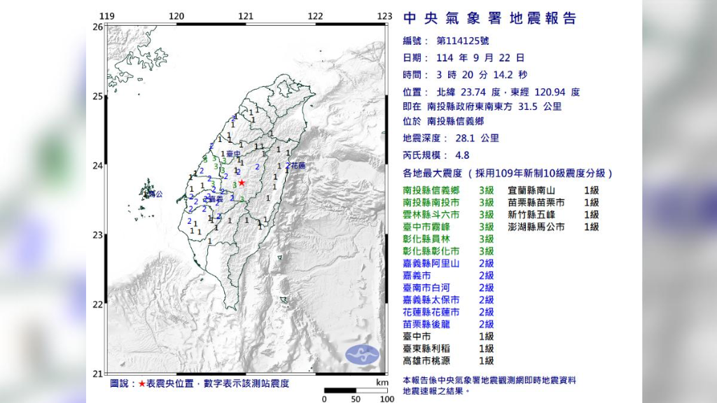 根據中央氣象署地震報告,今日凌晨3時20分左右,南投信義鄉發生芮氏規模4.8的地震,震央位於南投縣政府東南東方約31.5公里處、深度僅28.1公里,屬於極淺層地震。