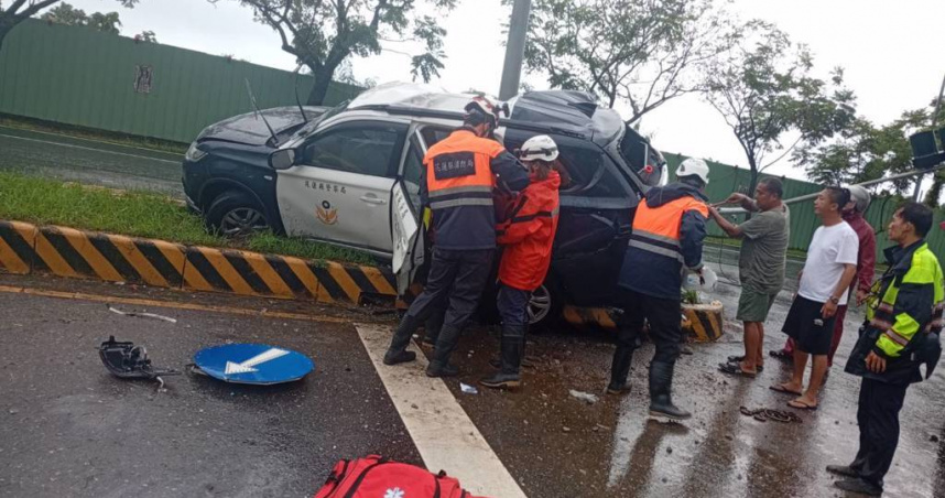 根據現場畫面,該輛警車因不明原因撞上分隔島,強烈撞擊力道讓車體嚴重變形,車輛零件和玻璃碎片散落一地,場面怵目驚心,後座的通緝犯當場失去生命跡象,2員警也身受重傷,被緊急送往慈濟醫院跟國軍醫院救治。