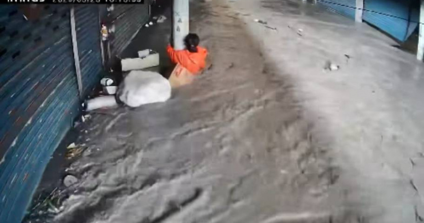 看著大量泥水湧入,民眾不斷驚呼,也不斷往高處撤離,有民眾也疑似來不及撤離,只能先爬上柱子避難。