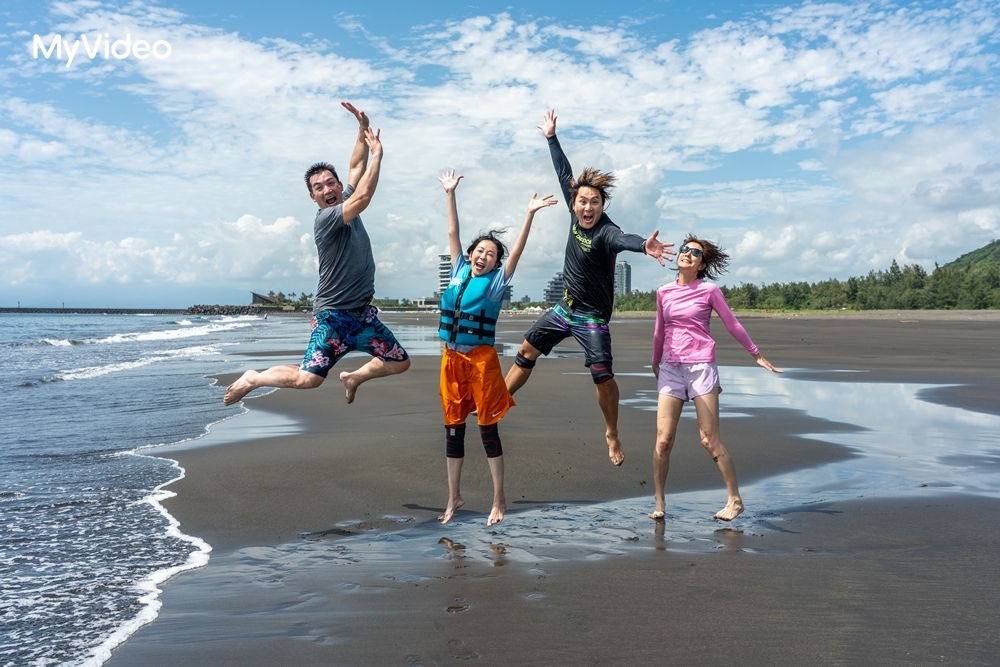 ▲ 伊正(左起)、況明潔、王仁甫與莎莎在宜蘭玩到忘齡。(圖:台灣大哥大MyVideo)