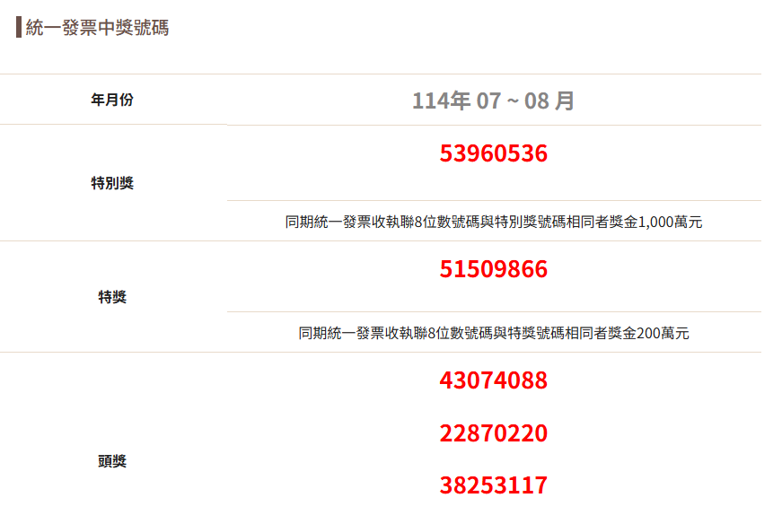 對中任何一組就能領獎,民眾可趕緊拿出7-8月發票對獎,千萬不要錯過財神降臨的好機會!