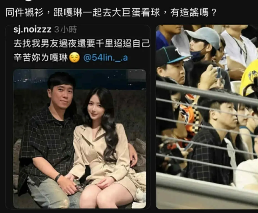 不過緋聞並未隨她退隊而落幕。近日有網友曝光照片,指稱嘎琳與黃苡峻曾並肩出現在大巨蛋觀眾席看球;更有人對比直播主蓉蓉曬出的「同框照」,指出黃男當天穿著相同的黑色格紋襯衫,質疑交往傳聞並非空穴來風。