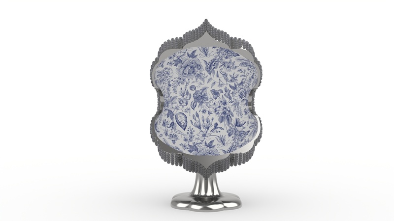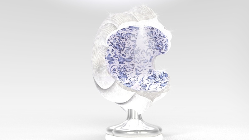 「開光如意椅」的外型設計巧妙地將二維圖紋翻轉為三維立體造型。設計師擷取青花陶瓷瓶上「開光」的曲線輪廓,以橢圓形軌跡進行旋轉,構建出具圍塑感的椅身和自然流暢的扶手造型。椅身內層綴飾青花圖紋,外層則鋪設太陽能板,兼具裝飾與機能。椅腳結構則將蒜頭型瓶身倒置並扁平化變形,設計成為獨特的支撐形式。主體選用不鏽鋼材質確保耐候性,椅腳表面施以電鍍金屬反射塗層,以提升太陽能板的光能收集效率。針對包覆性造型座椅上蓋,設計師以青花瓷瓶的「開光」概念演繹為現代的燈光照明手法,賦予實用加值的機能。