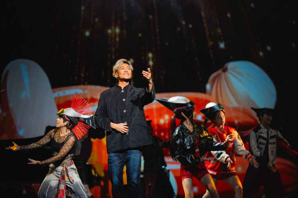 ▲ 林俊逸展現「模王」實力,舞台上模仿費玉清。(圖:全民大劇團)