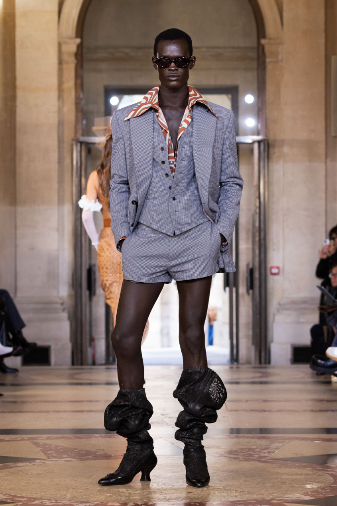 設計靈感起於對古老窗簾布料的研究,將其轉化為可穿戴的服裝。Andreas 選用義大利市集中常見的傳統布料,結合品牌經典印花,並重複利用工作室剩餘的布料,創造出既富詩意又貼近生活的作品。整體造型流露出一種輕鬆自然的氣息——經歲月淬鍊卻不陳舊,既優雅又真實,屬於穿著者本身。