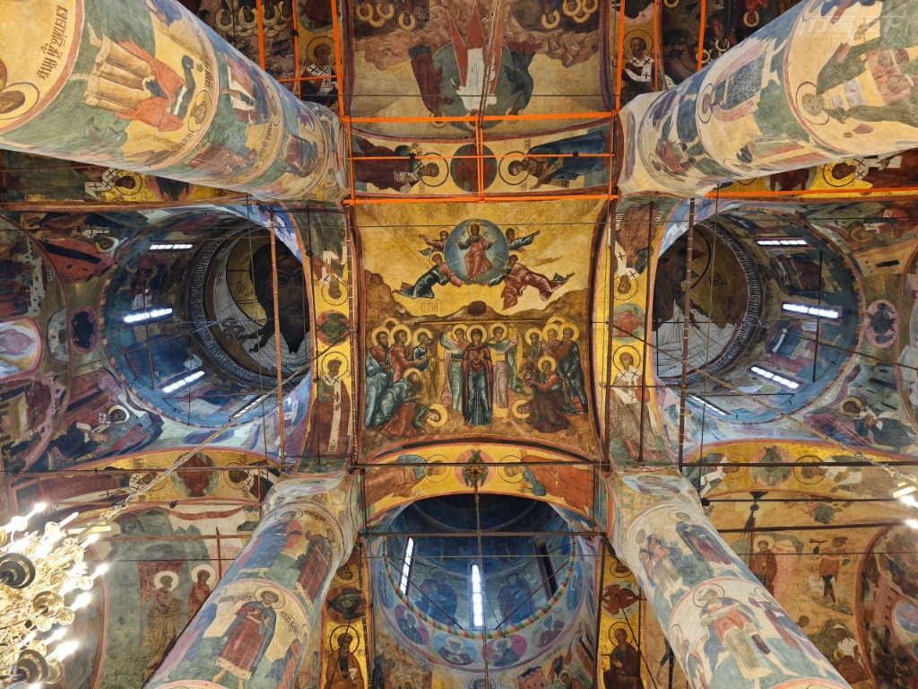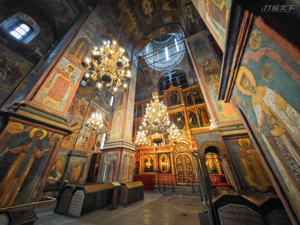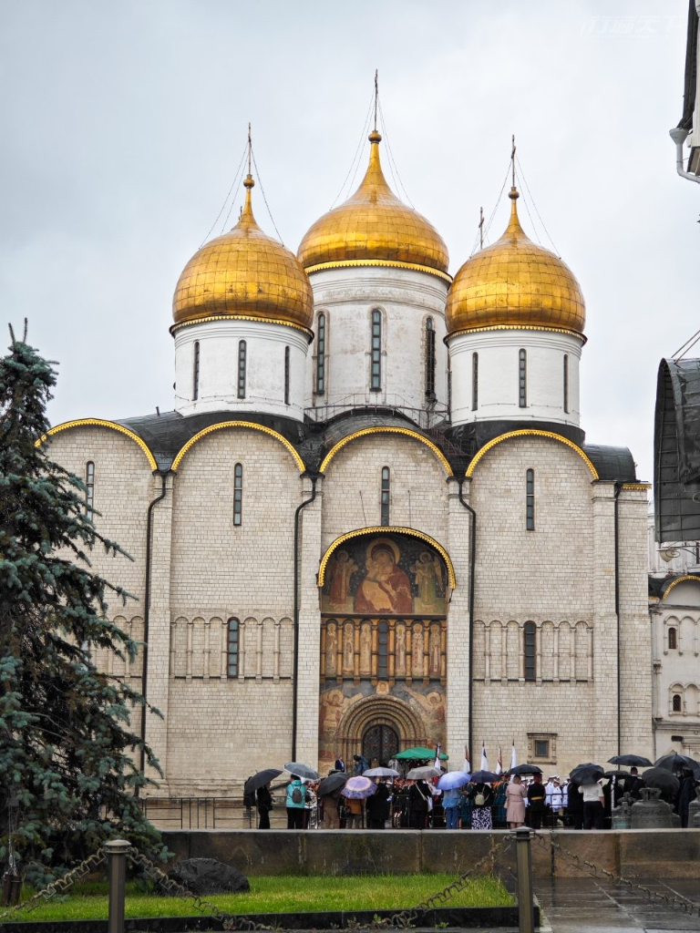 早上十點的莫斯科落著綿綿春雨。為了繞過因展演布置而封鎖的紅場,我冒雨繞一大圈,好不容易抵達亞歷山大花園售票廳換票,接著還得再排隊、過安檢,終於踏進克里姆林宮,好巧不巧,這天偏偏遇上了軍校生的畢業典禮!大教堂廣場四周拉起管制線,我鑽進人群中張望:一群稚氣未脫的少男少女無視雨勢,正進行著莊嚴儀式;待一小時典禮結束後,又立刻褪去肅穆表情,紛紛拿出手機,用鏡頭紀錄青春笑語。我也終於喜迎解封,開始了克宮教堂群之旅。說真的,一口氣參觀完聖母升天大教堂、大天使主教座堂、聖母法衣存放教堂等十四世紀流傳至今的建築精品,果真有些吃不消,光是內部那金碧輝煌滿溢的程度,很難不引起審美疲勞。俄羅斯東正教教堂的內部裝飾風格,跟我之前拜訪過的歐洲天主教堂完全不同:華麗吊燈、滿牆壁畫、金燦塗飾,就連每根柱子都被彩繪得密密麻麻,簡直像走進了古埃及法老的墓室。