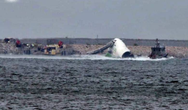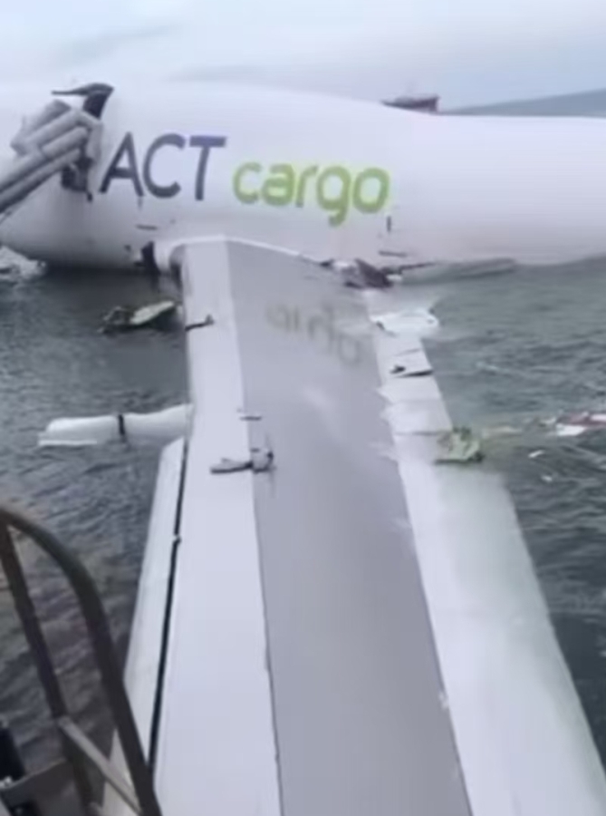 ▲這架杜拜貨機降落香港機場時衝出跑道機身斷裂落海。