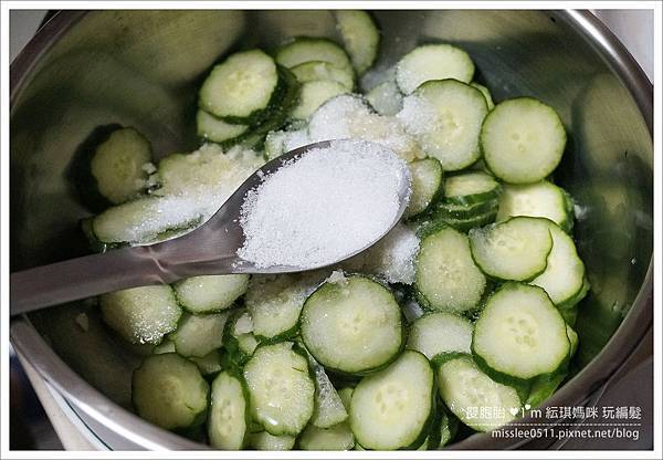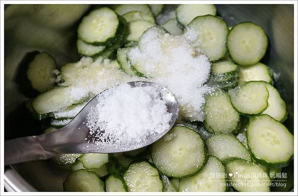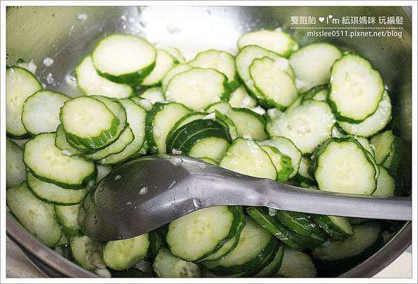 看了好多食譜,都說小黃瓜切完後要灑鹽巴,放進冰箱內二、三十分鐘使其入味、軟化!!