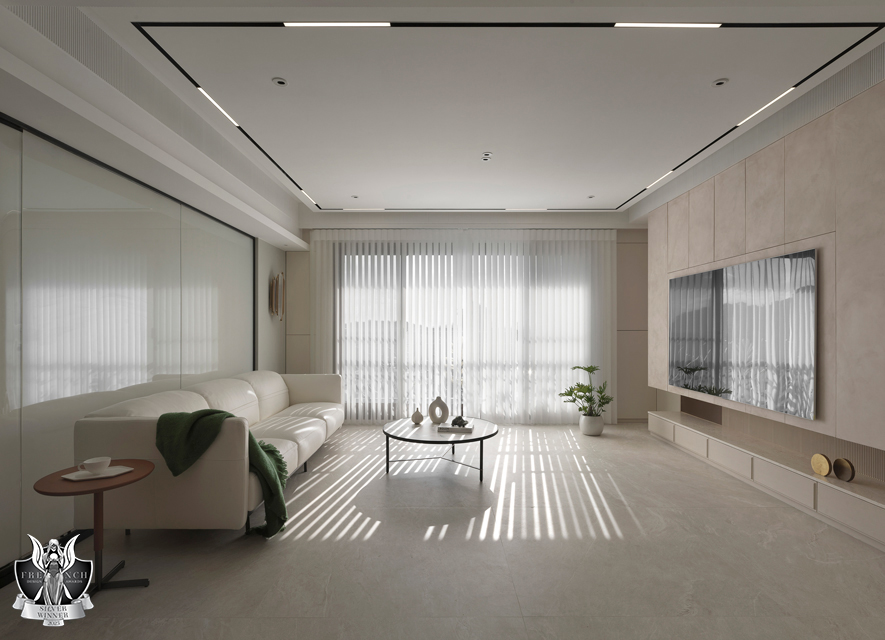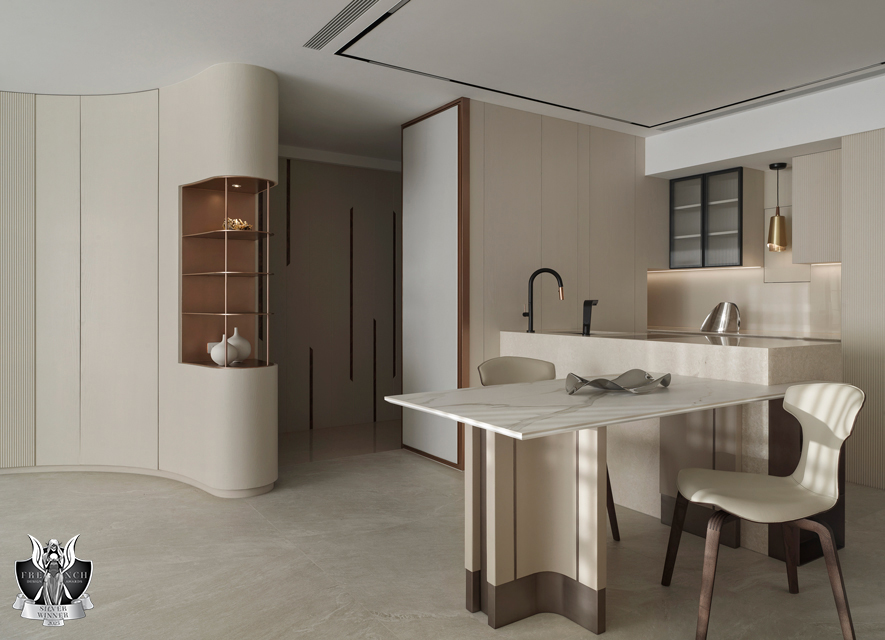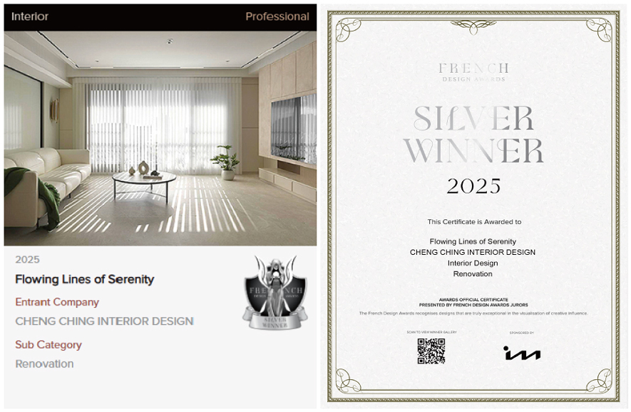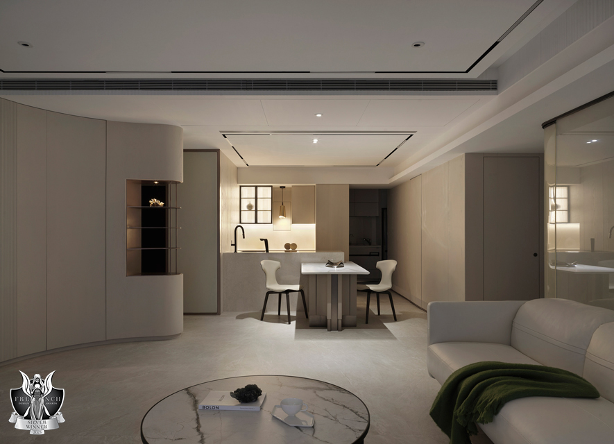 澄境設計 設計總監 鄭抿丹 運用圓弧設計規劃入門櫃體轉角,區隔過渡廊道與客廳,並透過流暢曲線銜接櫃面與電視牆,化解長形格局的剛硬壓迫感,搭配簡潔淡色基調,使公領域呈現輕盈舒適景觀,賦予一家四口明亮宜居環境,作品《弧光柔藝》於本屆賽事大放異彩,喜獲2025 French Design Awards銀獎榮譽!