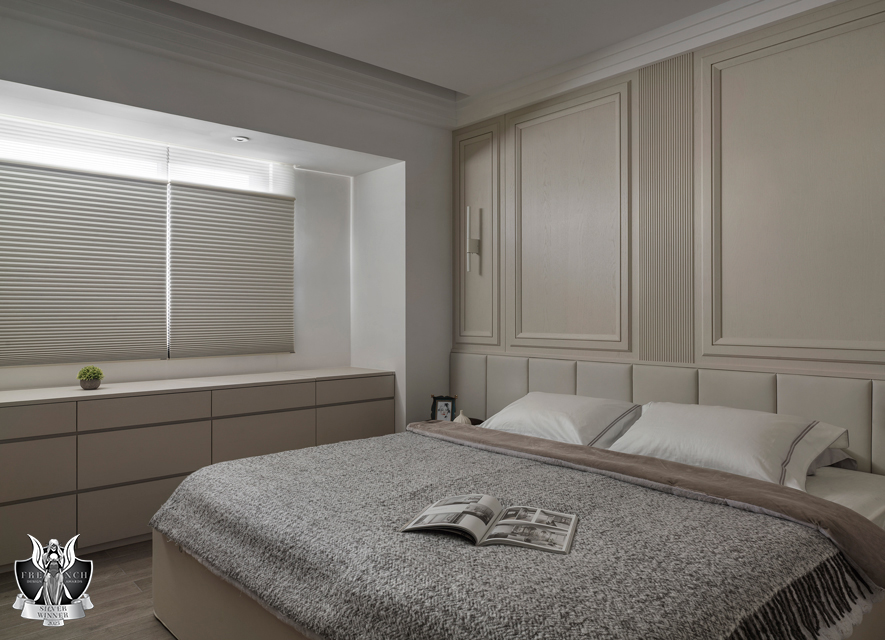 ▲主臥延續公領域的米色及線板造型,溫暖調性與簡潔畫面構築舒心酣眠場所;窗畔梳妝桌旁設置內含插座的儲納櫃,貼合生活習慣,提升日常便利性。