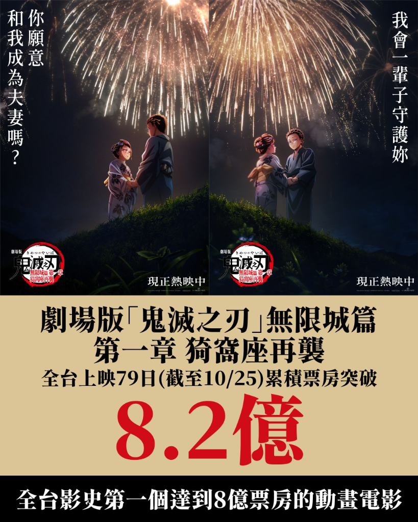 《劇場版「鬼滅之刃」無限城篇 第一章 猗窩座再襲》自 8 月 8 日上映以來票房一路狂飆,不僅刷新台灣動畫電影票房紀錄,截至 10 月 25 日更以突破 8.2 億元的驚人佳績,勇奪全台影史票房第 4 名。憑藉強勁話題熱度與粉絲間口碑發酵,延續「鬼滅之刃」的全球超級人氣,成功奠定年度最受矚目動畫電影地位。