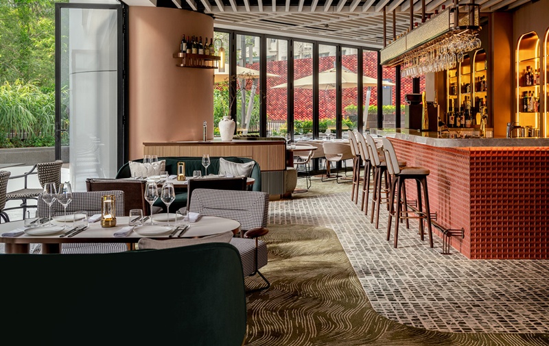 連接吧台的休閒區,落地窗旁擺放著黑白千鳥格紋的椅子。望出去即是露天座 位區,黑白編織的藤製座椅在翠綠的植栽環繞下,與室內的黑白元素遙相呼應, 營造摩登俏皮的感覺。這片戶外天地與室內空間藉由大片的玻璃,創造出無縫銜 接的視覺效果,讓賓客得以在自然光與微風中,享受美食與美景的雙重饗宴。