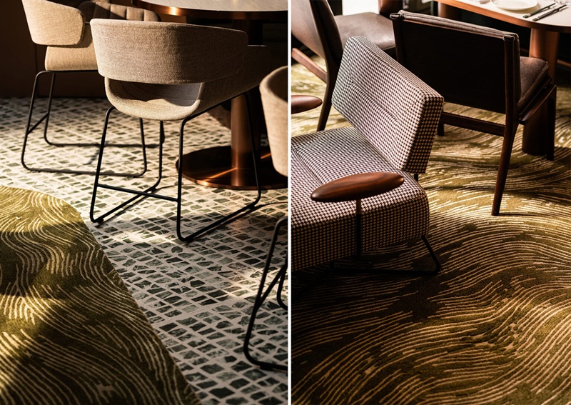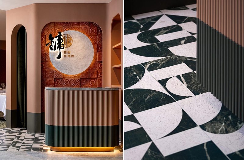 一踏入店內,目光即被入口牆面鑲嵌的凹凸起伏馬賽克所吸引。這些來自 1978 年的原版鏞記瓷磚,經重新染色後被賦予全新生命。它們不再是斑駁的記 憶碎片,而是被潤飾後的回憶拼圖,在燈光映照下閃爍著幽微光澤,呢喃著品牌 悠久的故事。