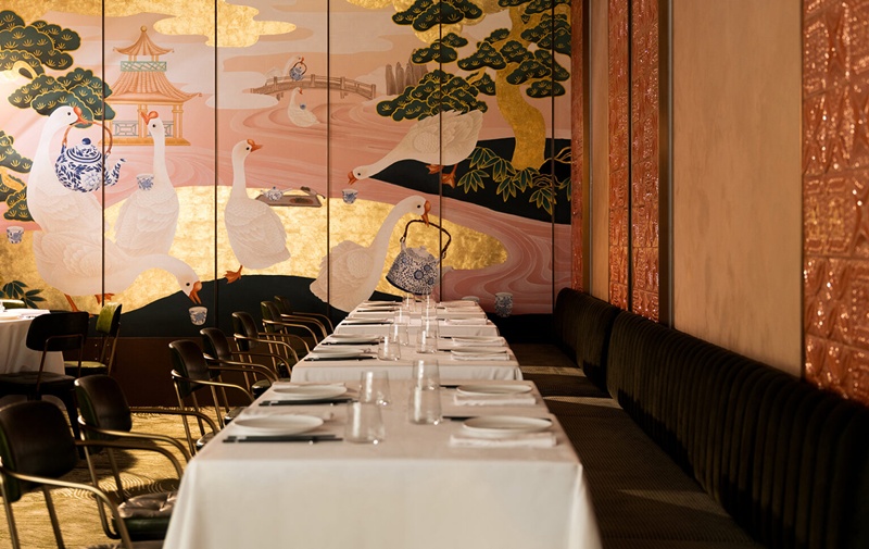 店內引人注目的精緻牆紙,出自國際牆紙品 牌 LALA CURIO。這一抹驚豔的東方神韻,運 用絲綢、手繪及手工刺繡等元素,以趣味手法 結合東方山水畫筆法,描繪出鵝群在湖畔悠然 自得的景緻。仔細品味,會發現牆紙上的鵝群 竟在斟茶對飲,傳統與幻想在此交織,描繪出 一幅嶄新的東方美學畫卷。這不僅是對品牌經 典燒鵝手藝的詩意致敬,更是一場關於藝術與 飲食的跨界對話,讓用餐的體驗昇華為一場視 覺與心靈的沉浸之旅。