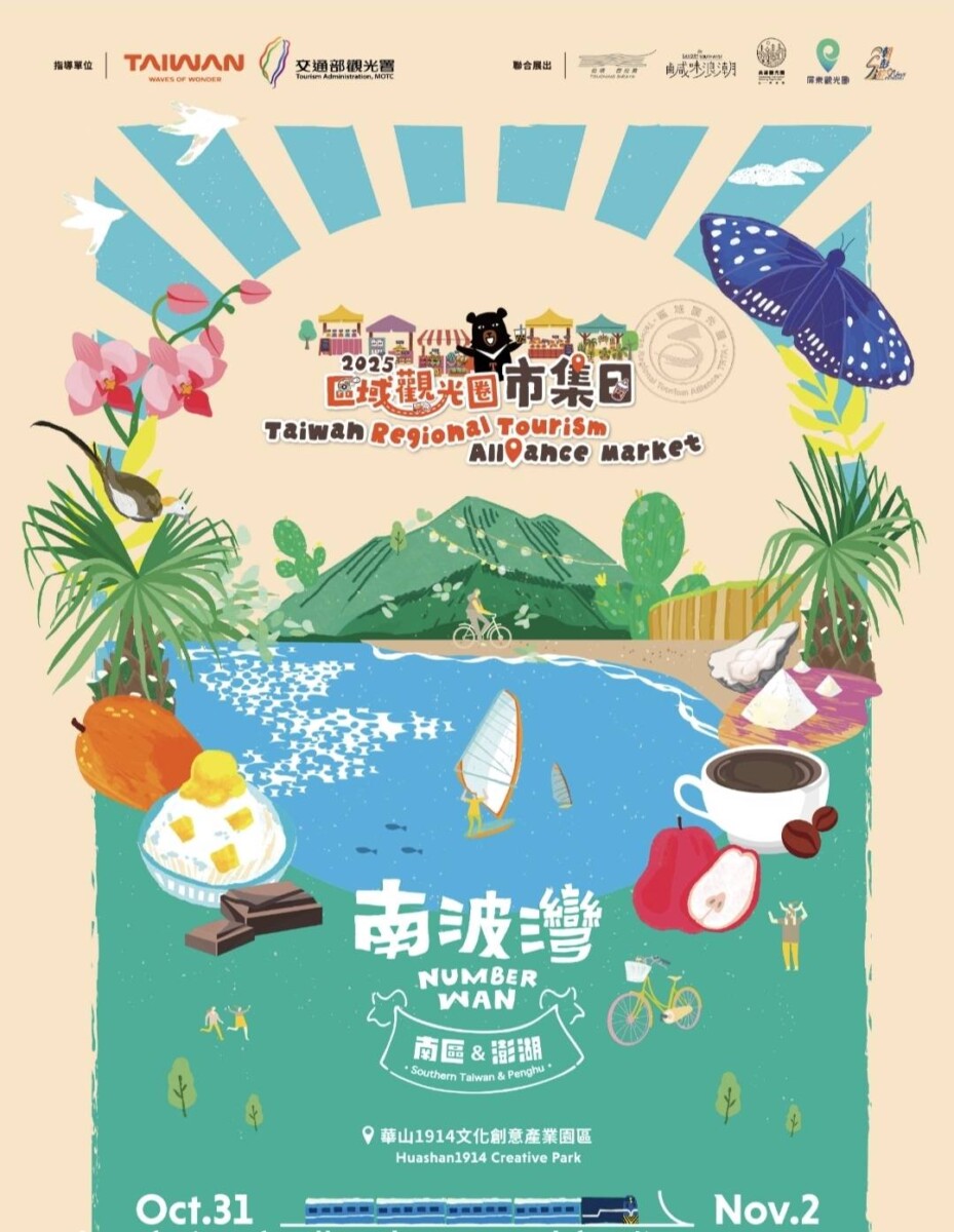 圖:由交通部觀光署指導、西拉雅國家風景區管理處主辦的「2025區域觀光圈市集日-南區&澎湖場」即將於10月31日(週五)至11月2日(周日)在臺北華山1914文化創意產業園區盛大登場,活動以「南波灣 Number WAN」為主題,內容精彩歡迎参觀。(照片觀光署西拉雅國家風景區管理處提供)