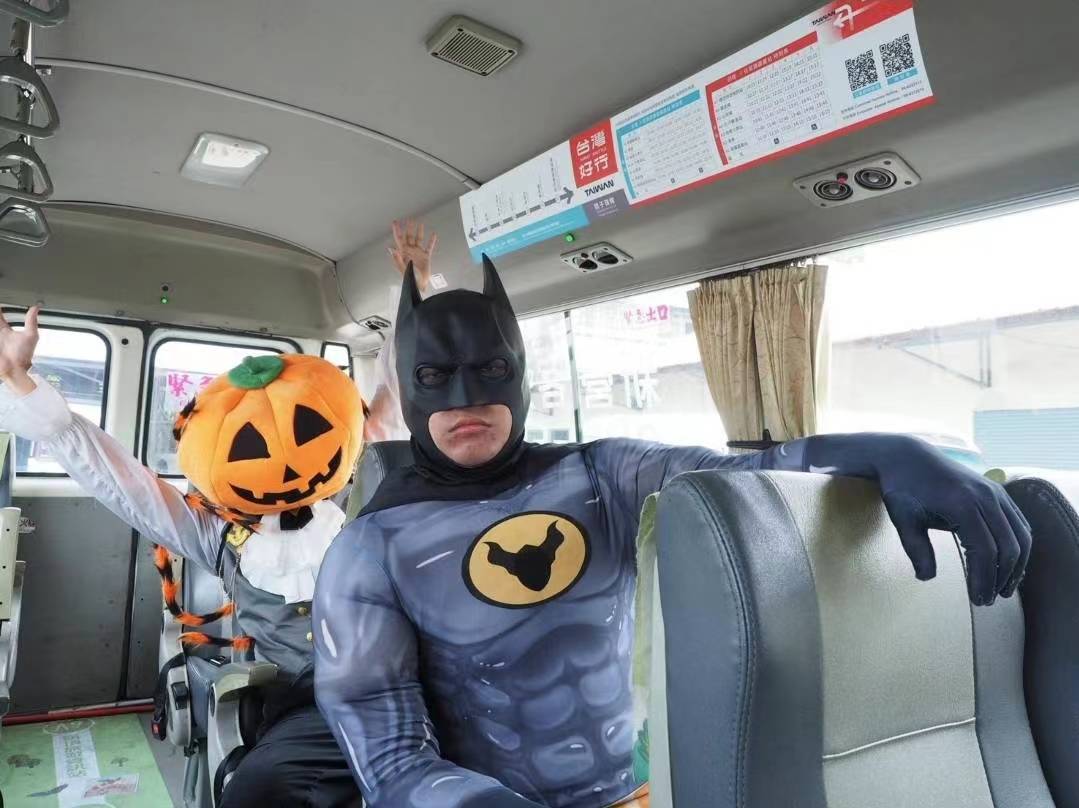 圖:「不給糖就搗蛋!」每年最搗蛋、最可愛的節日萬聖節來啦!這次蝙蝠俠將攜手他的好友「南瓜先生」,於10月31日至11月2日現身台灣好行菱波官田線「萬聖節專車」,邀請大家一起搭車搞怪、討糖拿好禮!(照片觀光署西拉雅國家風景區管理處提供)