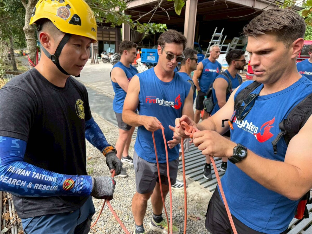 【記者 朱達志/台東 報導】臺東縣消防局與澳洲消防員訪問團的交流活動於昨(30)日進入第二天,繼首日在消防局進行的車禍救援演練後,雙方團隊移師至知本森林遊樂區,執行更具挑戰性的「山域救援技術交流」。消防局指出,課程聚焦於繩索架設與傷患搬運等核心戰技 ,透過實地操作,深化雙方在臺東特殊山林環境下的救援合作默契。