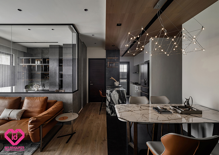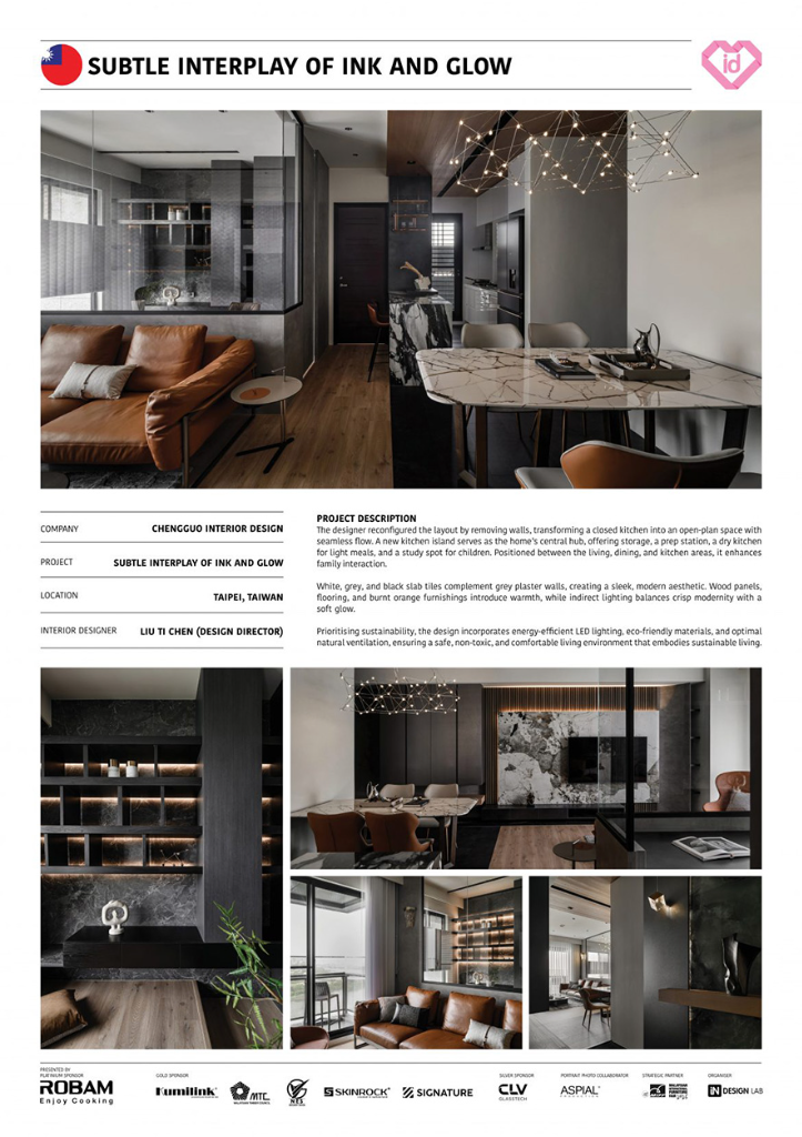洆果設計 設計總監 劉笛榛 以精湛的空間整合技巧,於家宅《潤墨輕光》中巧妙移除原有隔牆,打造開放式餐廚格局,並設置多功能室作為核心生活場域之一,不僅豐富儲納機能,更促進家庭成員間的情感交流,營造溫馨活力的家居環境,獲 2025 My Favourite International Design
