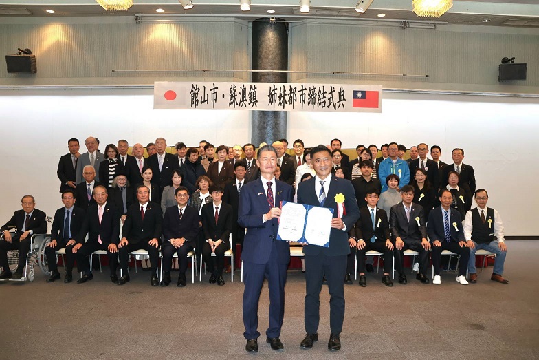 蘇澳鎮與館山市締盟活動,於館山溫泉夕日海岸鶴飯店登場。兩市鎮以四個基礎為出發點締結姐妹市盟約,包括:雙方將持續交流並維繫情誼;尊重彼此文化差異推動各項合作;以經濟物產為出發點,促進產業發展;以市鎮居民福祉為重,加深民生連結合作。