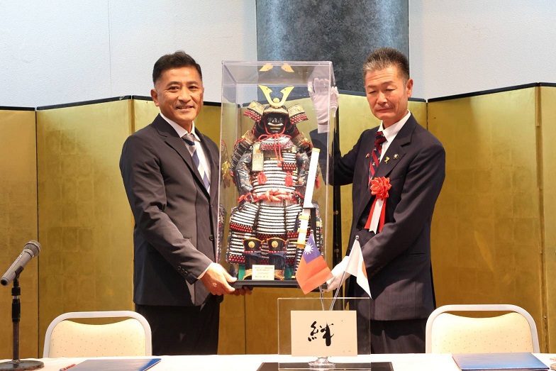 ▲蘇澳鎮長李明哲(左)接受館山市長森正一代表贈送的日本盔甲武士。