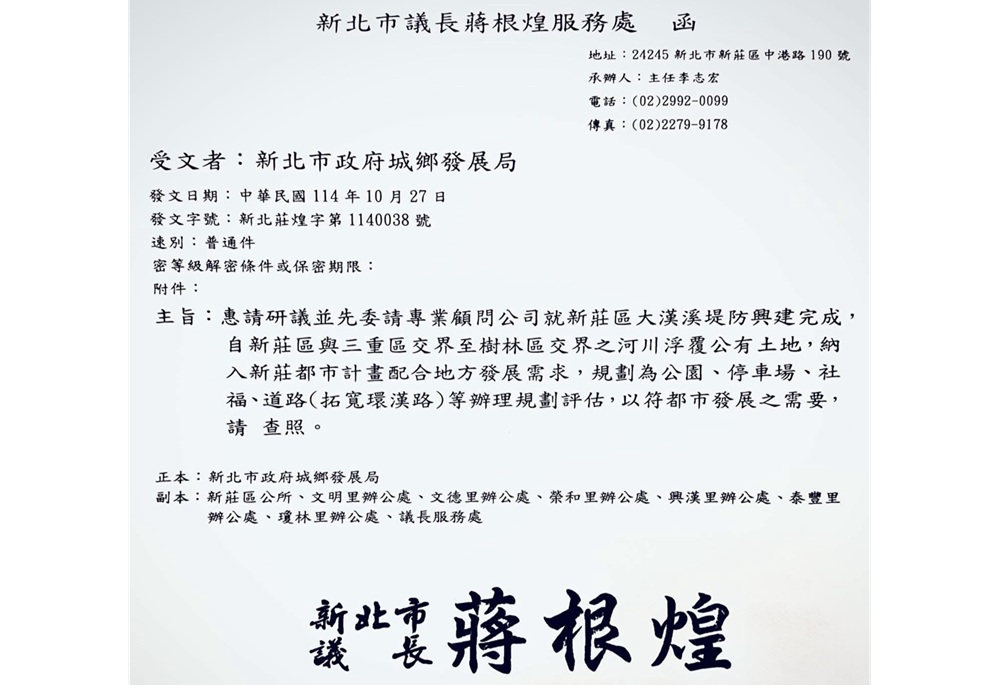 新北市議員蔣根煌為了推動新莊區整體宜居發展,日前已正式去函新北市政府城鄉發展局,商請市府先行委託專業顧問公司,針對大漢溪沿岸公有土地進行整體利用評估與發展可行性研究。