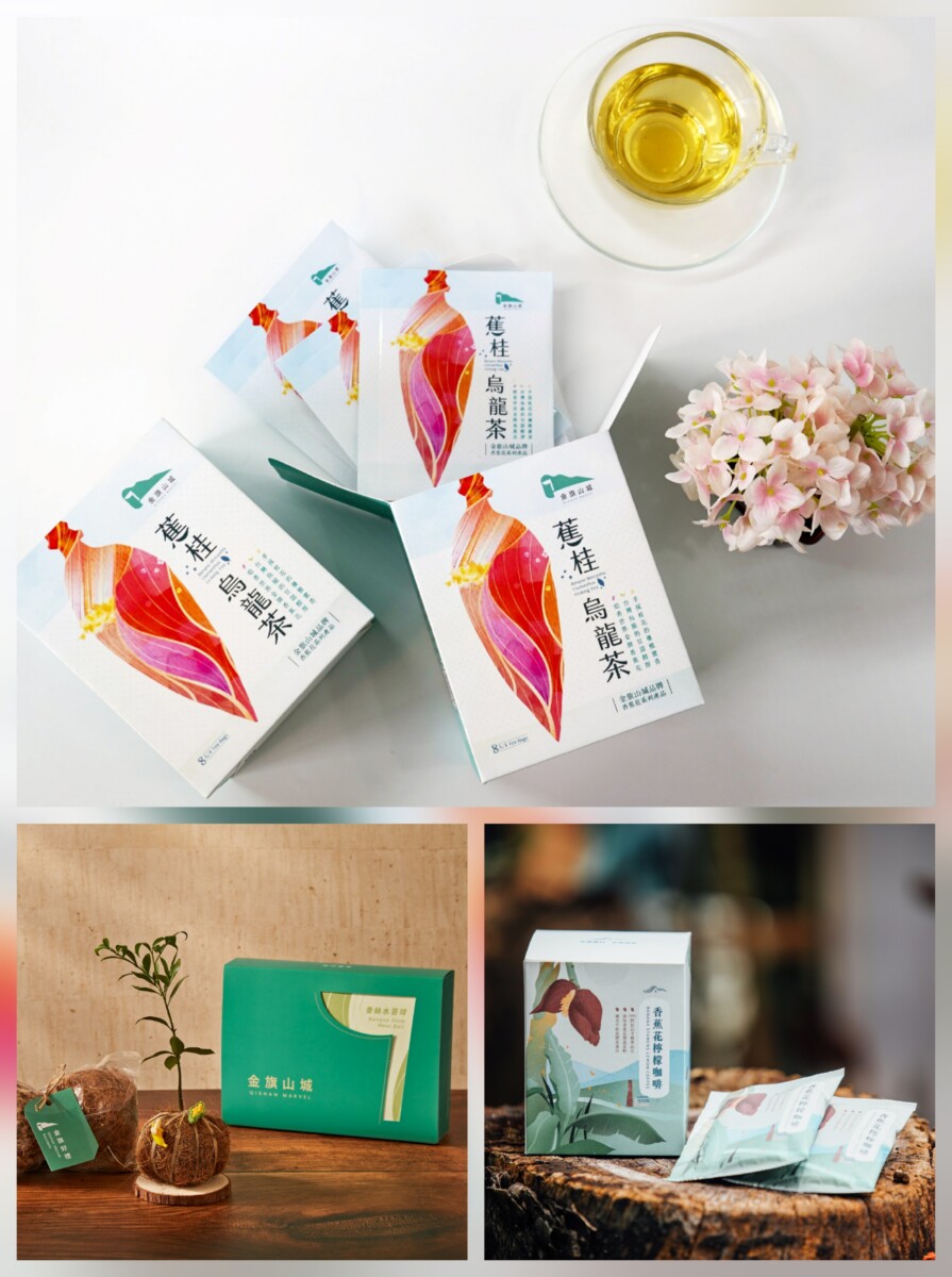 ▲「金旗山城」-蕉桂烏龍茶、香蕉絲水苔球DIY禮盒、香蕉花檸檬咖啡。