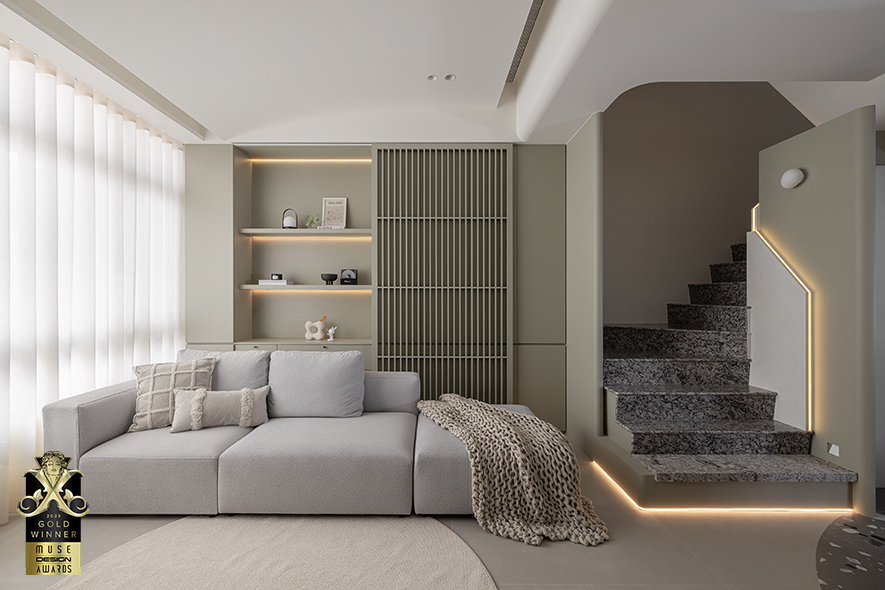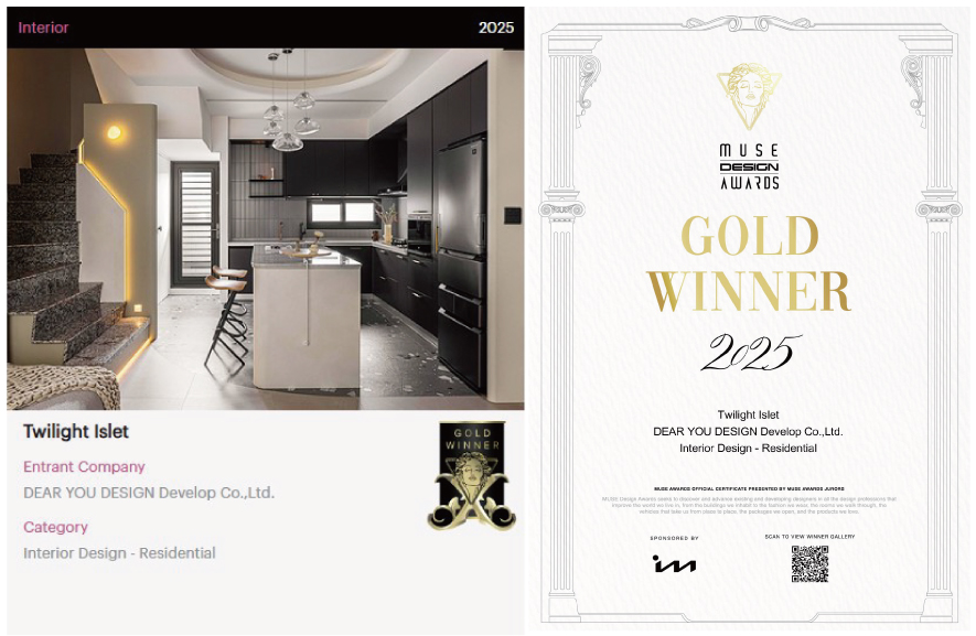 堅守「以人為本、環境友善」的創作初心,從細微的牆面熱感應燈為長輩與幼童點亮安全路徑,到隱藏式收納最大化家庭的開闊感受;從精選低甲醛環保建材守護居住安全,到運用LED與自然光源,打造節能健康宅《暮光微嶼》,每一處設計決策皆高度契合大賽「發掘兼具創新精神與人文關懷的設計」宗旨,喜獲2025 MUSE Design