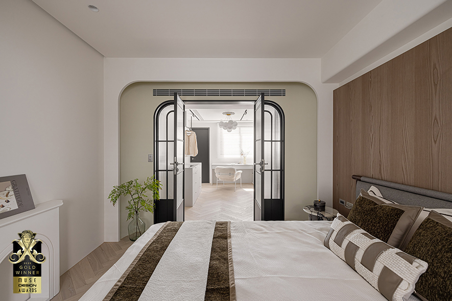 ▲睡眠區及更衣室交界處設置黑色鐵件拱形對開門,並巧妙運用原有門上大樑限制,將吊隱式冷氣出風口整合於樑下,在牆面色彩變化處延續拱形造型的木作設計,框出優美景深層次。