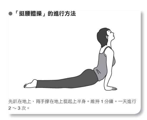 方法非常簡單,如下一頁圖示,趴在地上,用兩手撐地,挺起上半身,維持這種像海狗一樣的姿勢約一分鐘。