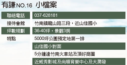 緊鄰新竹最具美景的竹南,除了可鳥瞰海景外,也由於交通便利,再加上房價平易近人,近年也成為新竹科學園區竹科人選購房產的新選擇。竹南新建案「有謙NO.16」以景觀3房、27%超低公設比的建築規畫,打造出具有絕佳生活環境的幸福好宅。