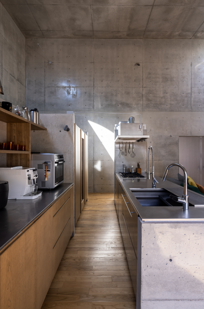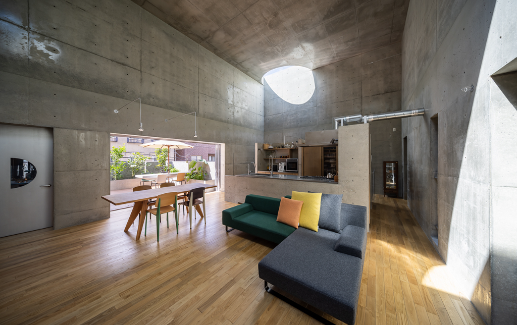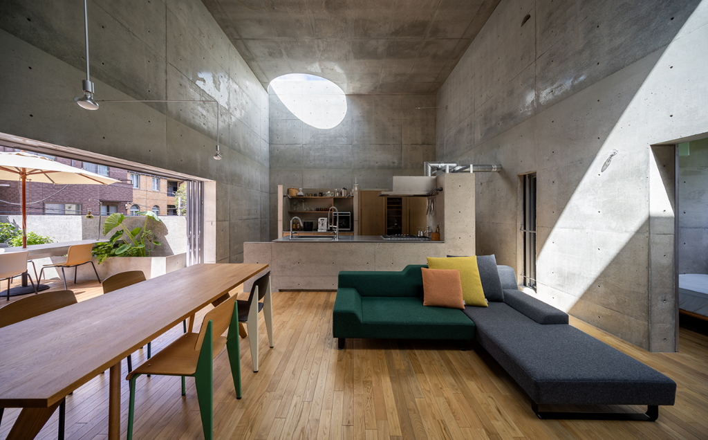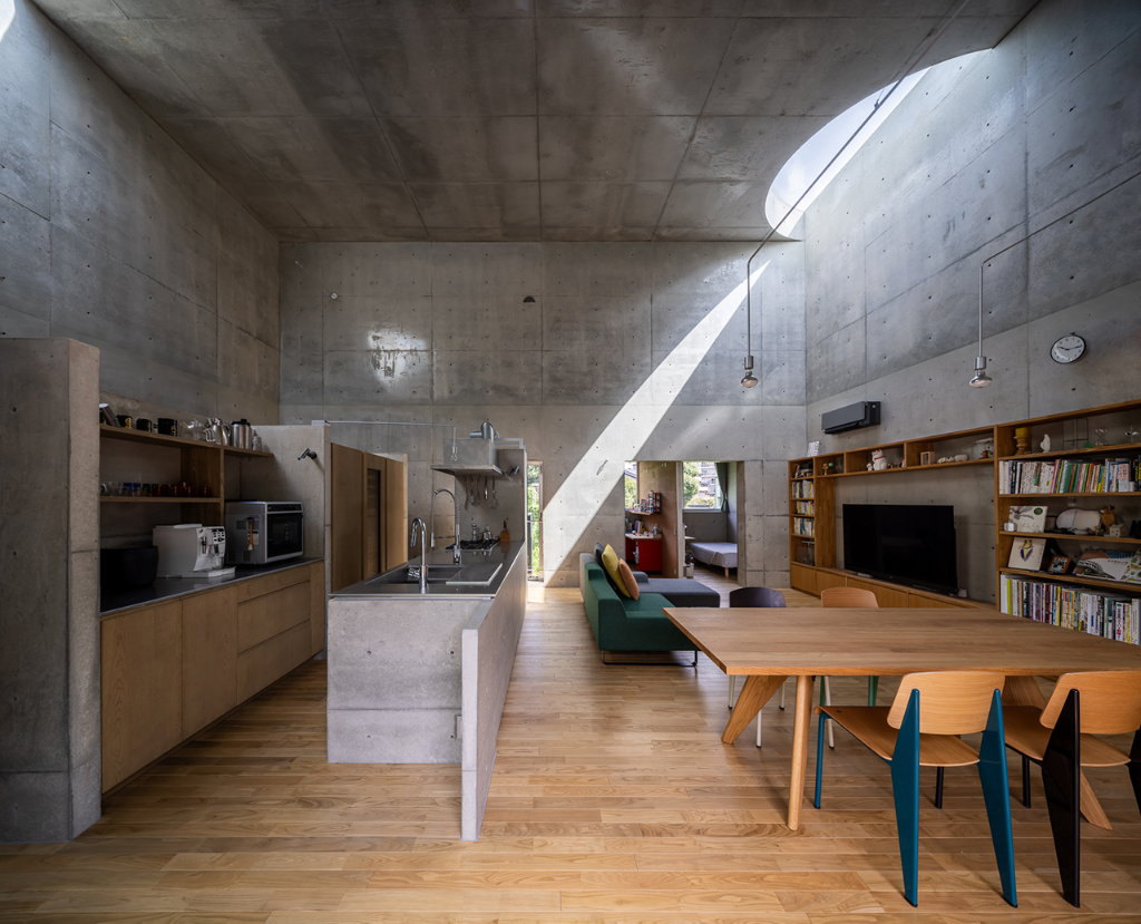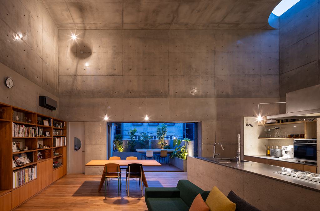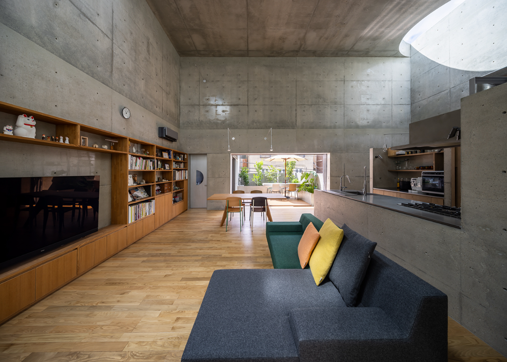 有些房子的存在意義不是躲避喧囂,而是用來與城市和諧共生,讓光、風、雨水與盎然翠綠,都能在這裡找到安放的位置。東京區彌生町的一家四口,就在這樣的住所裡展開愜意生活。二樓作為家的核心,高達近六米的公共場域,時時迎接從屋頂灑下的光,白天與夜晚在清水混凝土牆面上留下不同表情;地面層則留給車庫與工作室,回家的腳步隨階梯而上,先與自然相遇,再與家人相聚。