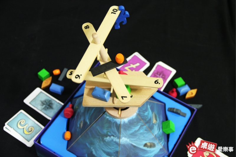 海盜一向是這艘商船苦惱的問題,因為船長想出了一個奇特的方法─把貨物全部收在高高的桅杆上─沒有任何人能夠輕易地接近它們。這個法子雖然能夠有效地保護貨物,但是當船在海上遭遇到驚濤駭浪之時,搖晃的甲板讓貨物左右傾倒,經驗老到的水手們,必須在一眨眼的時間內,接住這些不斷落下的貨品…搖晃的船、架高的圖板和藍色的遊戲盒內襯,生動地營造出海面上驚濤駭浪的情境,貨物掉落時會有掉進海中的帶入感。比起其他許多的平衡桌遊,《驚濤駭浪》在主題情境上遠遠將它們拋在腦後,在放置貨物時還要注意是否有貨物會掉落,要眼明手快地去接住它們,緊張感不言可喻,完全顛覆既有平衡遊戲的觀念。