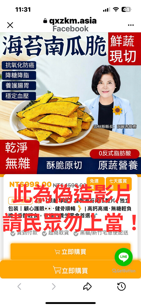 【記者 劉春生/雲林 報導】近日社群平台出現「張麗善縣長推薦『海苔南瓜脆片』」之影片,經民眾檢舉後,雲林縣政府農業處查證確認,該影片為偽造變造內容,並非縣府製作或授權發布,縣府已於第一時間通報警察局偵辦,追查來源與製作者,依法究辦。