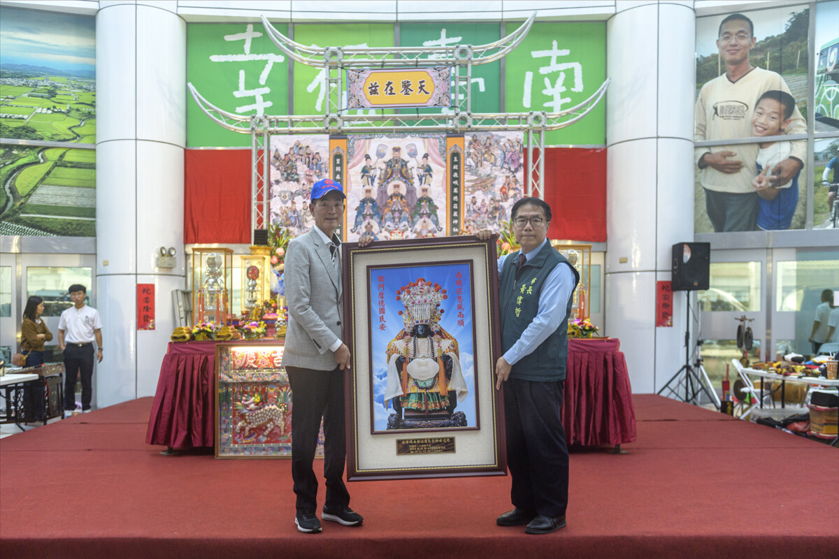 ▲北港朝天宮董事長蔡咏鍀致贈媽祖像予台南市,象徵北港與台南兩地媽祖信仰情誼深厚。(記者劉秋菊攝影)