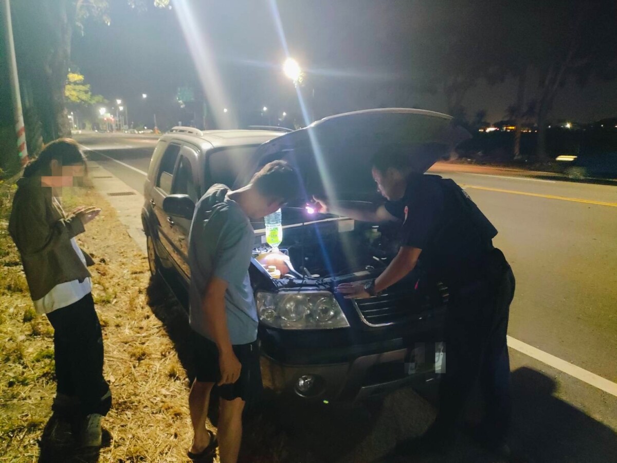 經了解,楊男(65歲)當晚自台南住家出發,準備載送就讀大學女兒返回楠梓學校,不料行經途中,車輛引擎冒煙拋錨,疑因水箱缺水導致故障。員警見狀立即上前協助,加水檢修後成功讓車輛恢復運作。