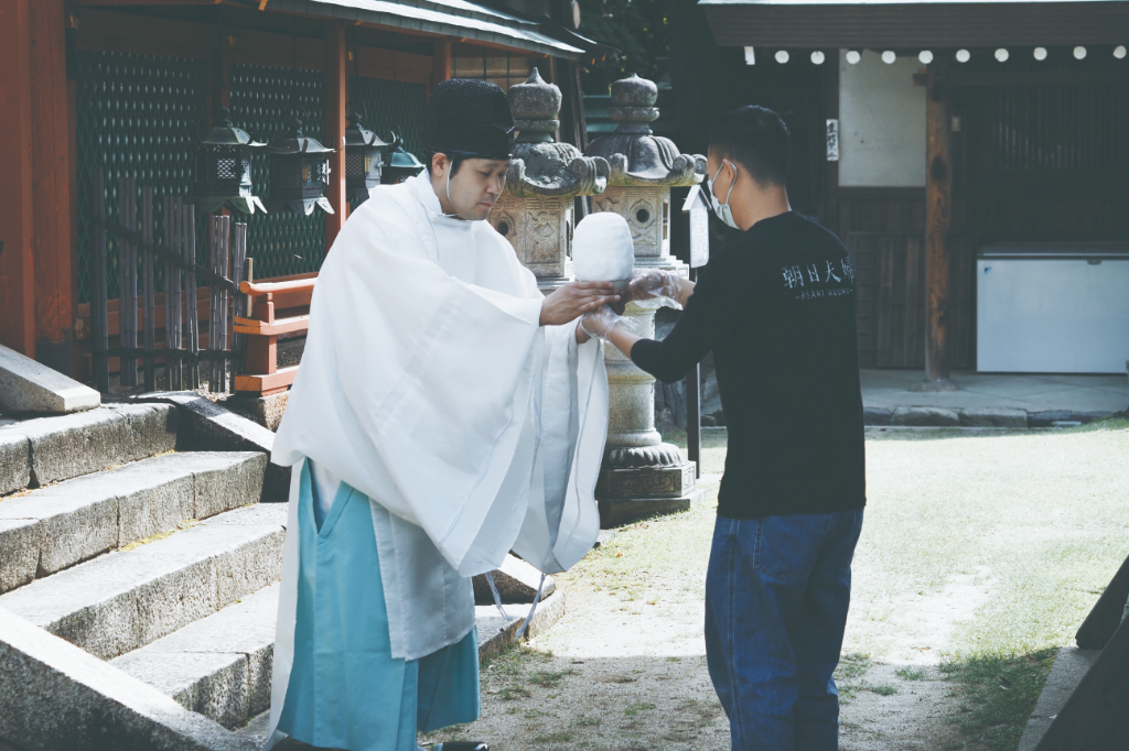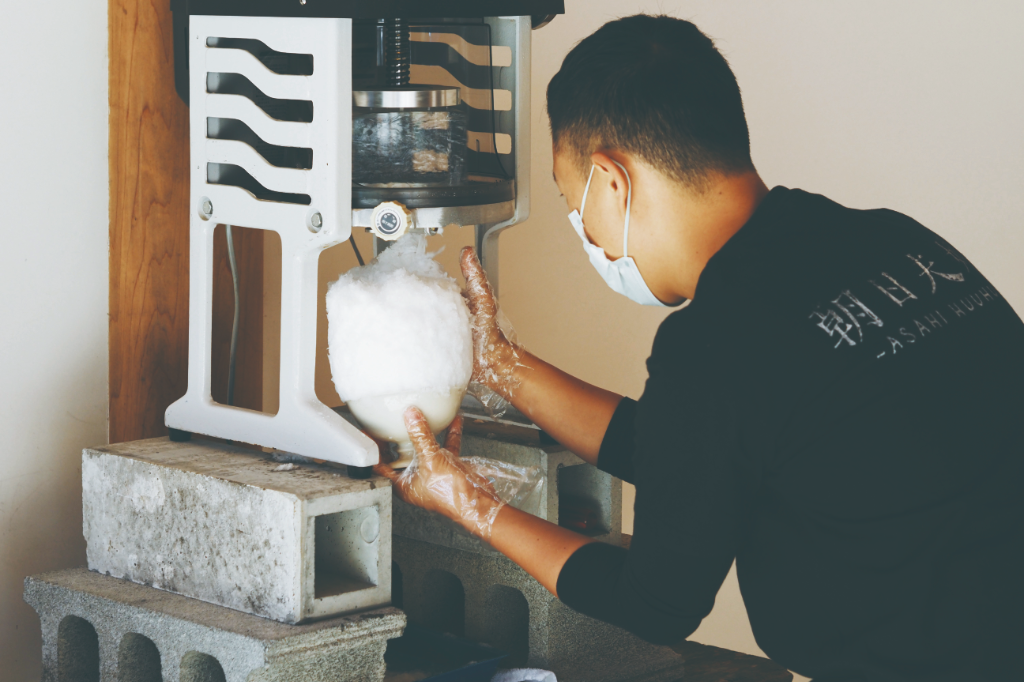 朝日夫婦相當緊張,特地帶了店裡專用的器皿和醬料。儀式依照表定時間開始,老闆威宇進入一旁的房間裡,準備即將獻上的刨冰。他取出從臺灣帶到祭典現場的潔白高腳碗,相當恭敬地盛裝成飽滿漂亮的刨冰,等待神官唸頌祝禱詞之後,緩步進到神社的拜殿當中;雙手將整碗刨冰獻給神官,主祭神官再進入本殿內,將刨冰獻給三位主神。此時,眾人(冰店店主及製冰業者們)也隨著神官指揮,拍手拜禮,儀式過程隆重且莊嚴肅靜,觀禮的諸多民眾都默聲祈禱,隨著一旁的神樂伴奏,這是我們從未體驗過的氛圍。完成獻冰後,身為主辦單位的「寶石盒」(ほうせき箱)老闆為這場別具意義的第十屆展會揭開序幕,當然也介紹了朝日夫婦刨冰店。