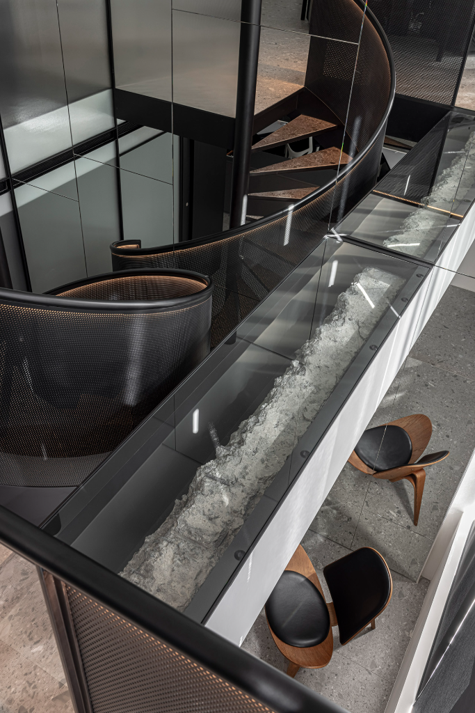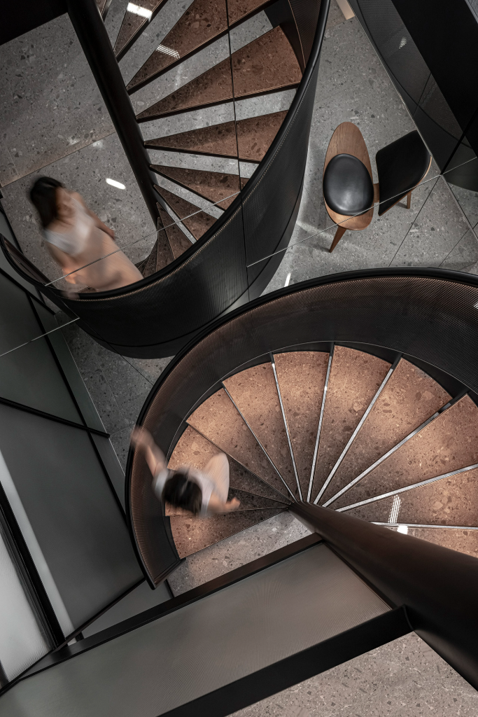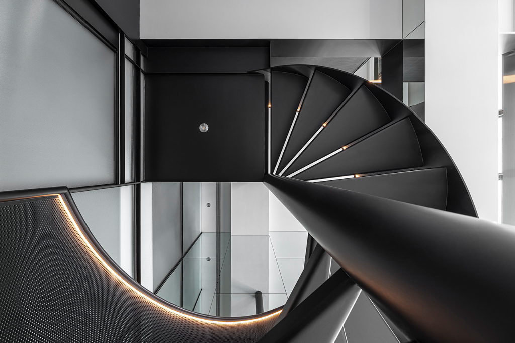 空間共分上下兩層,總面積約75坪,最高樓高近六米。設計師以「光的軌跡」作為設計主軸,藉由一座圓弧旋梯將動線與視覺聚焦點串聯起來。這道樓梯不只是垂直移動的載體,更是光線流動的路徑。隨著階梯拾級而上,內嵌的光帶讓人彷彿走進一條光的通道,映照出空間的節奏與層次,也無聲地述說企業歷程的向上延展。