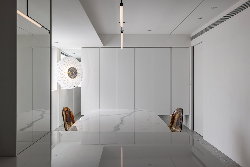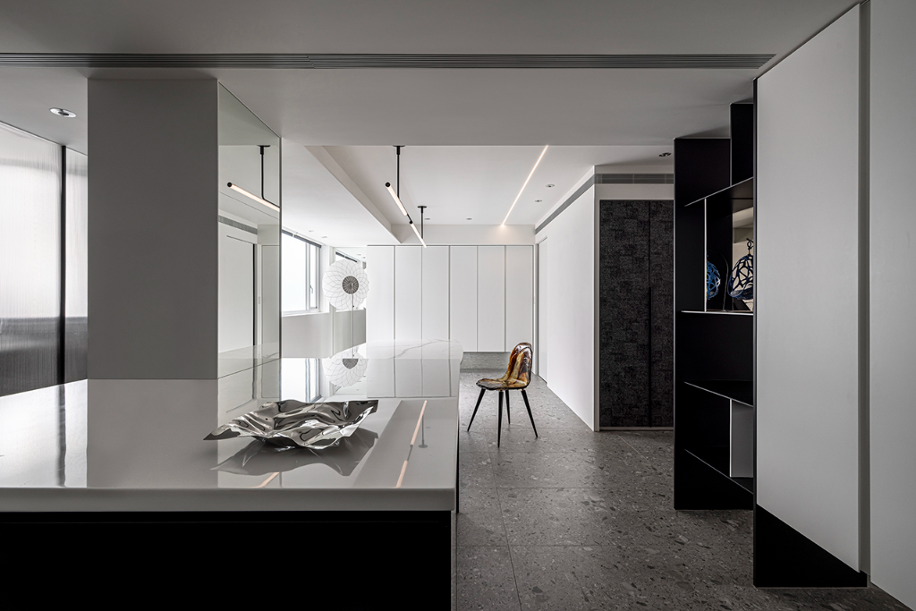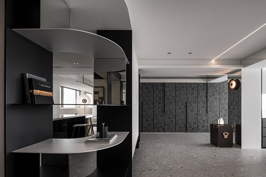 材質與色彩策略亦同樣展現成熟內斂的美學觀。整體以黑、灰、白為基調,佐以鐵板染色、氟化鏡面、礦物塗料與清水混凝土質地,使場域呈現沉穩中帶層次的質感。牆面上編織肌理的黑灰色收納牆,隱性整合了功能,亦形塑出安定與秩序的氣場;鏡面則反射光線與樑體,使空間擁有更深的維度延伸。