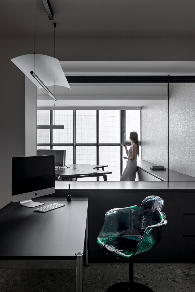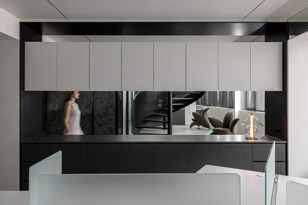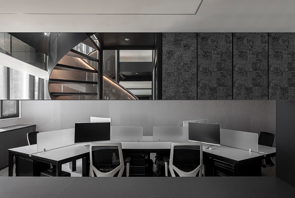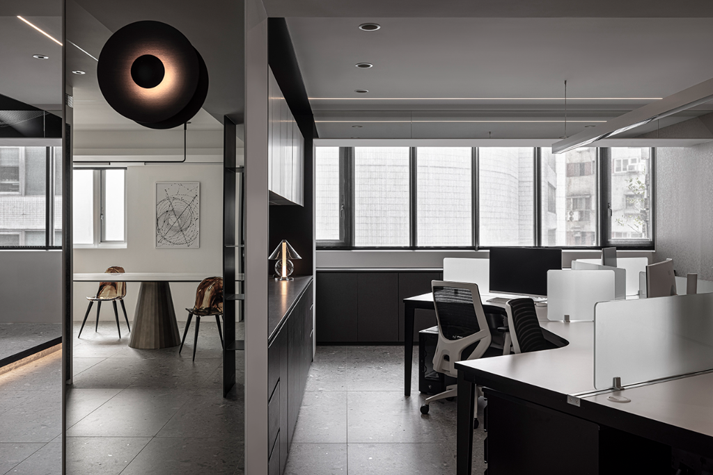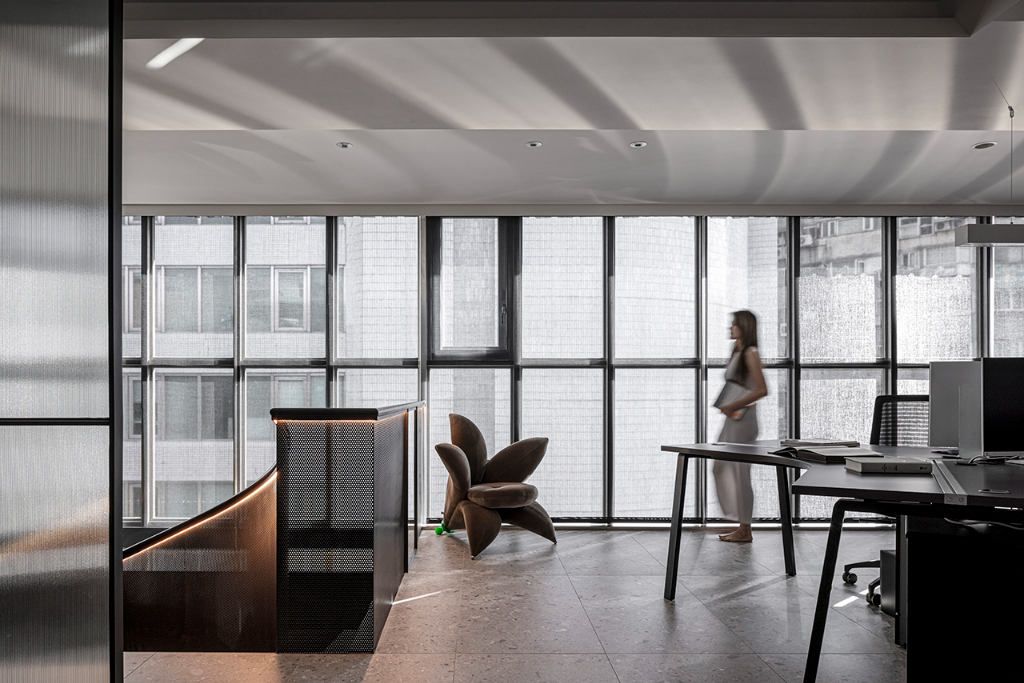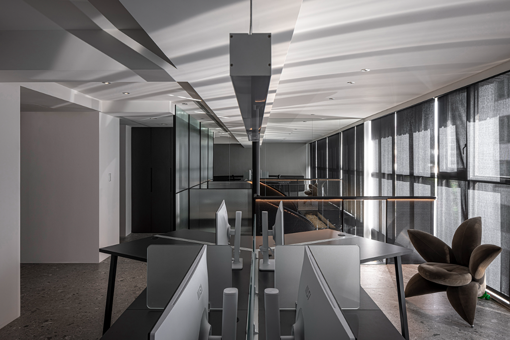 考量到原始格局的一字形樓梯阻礙了視線與採光,設計師果斷將其更改為靠窗的旋梯,使自然光得以大面積導入,使樓上樓下不再是封閉的區隔,而是一段以光為界的互動旅程。樓上為行政與會計辦公區,樓下則規劃為接待、會議與彈性交流空間。開放式的格局讓各功能區域保有各自定位,同時又維持視線的流動與連結。
