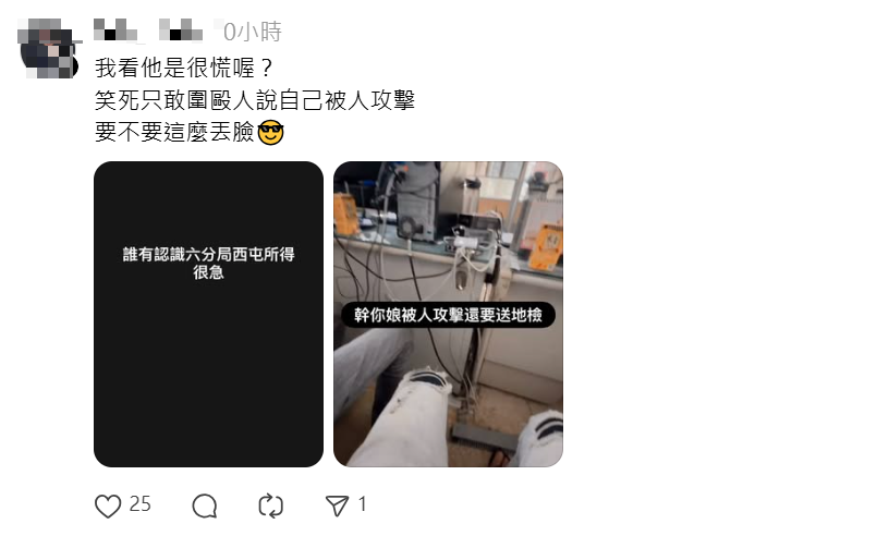 還有網友肉搜發現其中一名惡煞疑似經營刺青店,工作室就在西屯區,被逮捕後還在派出所內發限動嗆說:「幹X娘被人攻擊還要送地檢」,還有人發文:「誰有認識六分局西屯所得很急」,似乎是想找人來關說。