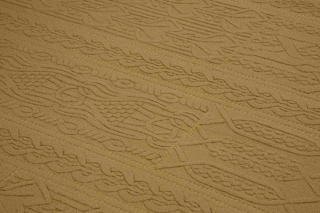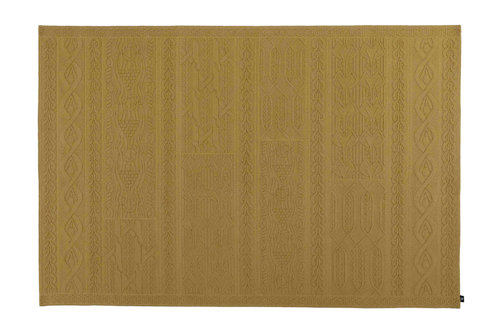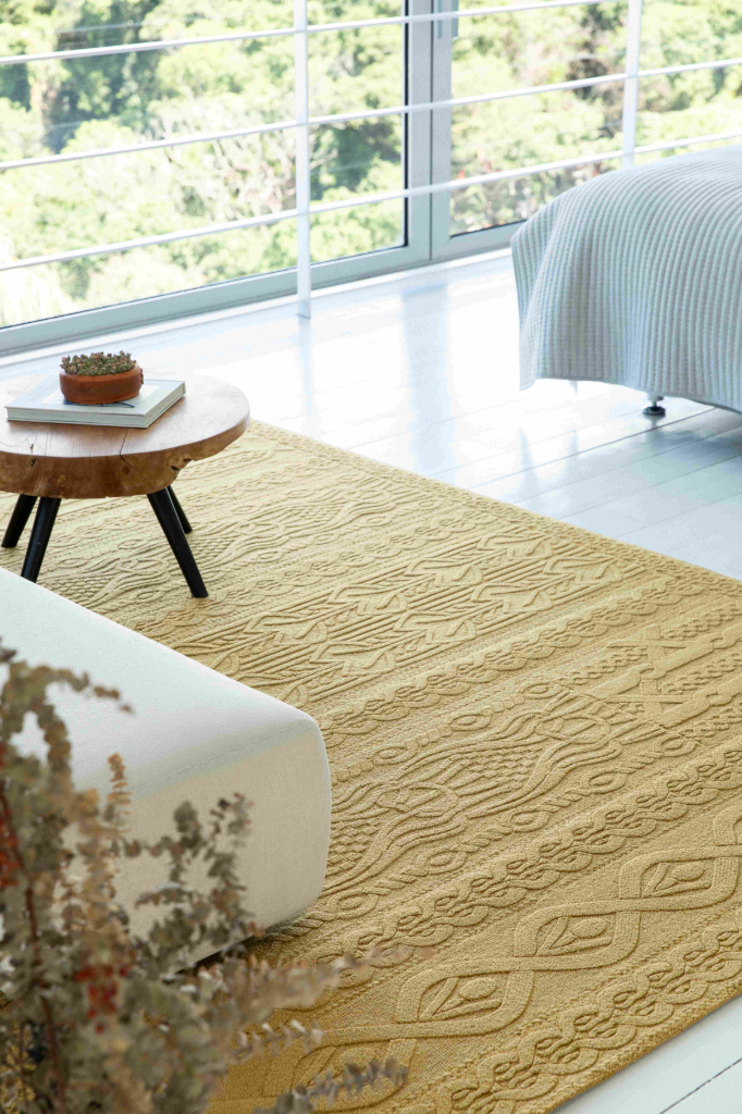 以手工簇絨工藝,以及針繡、雕花和斜邊處理等技巧,細緻地探索針織的幾何美感,體現靜謐與安逸的精髓。最終呈現一幅具有雕塑感的編織掛毯,芥末黃調散發溫暖氣息與藝術格調。
