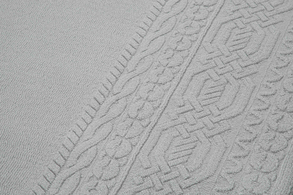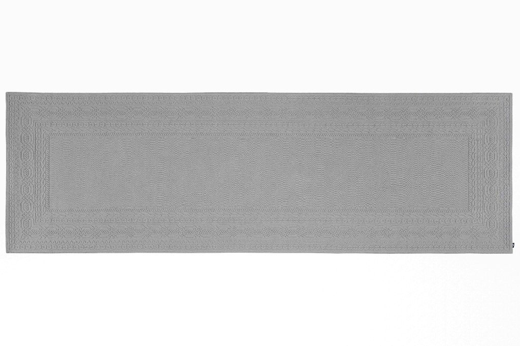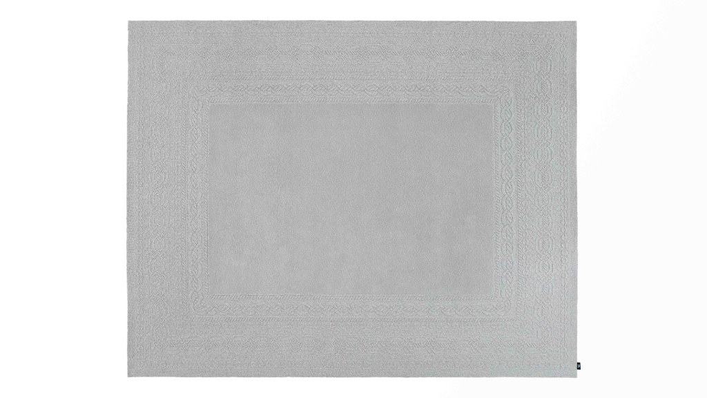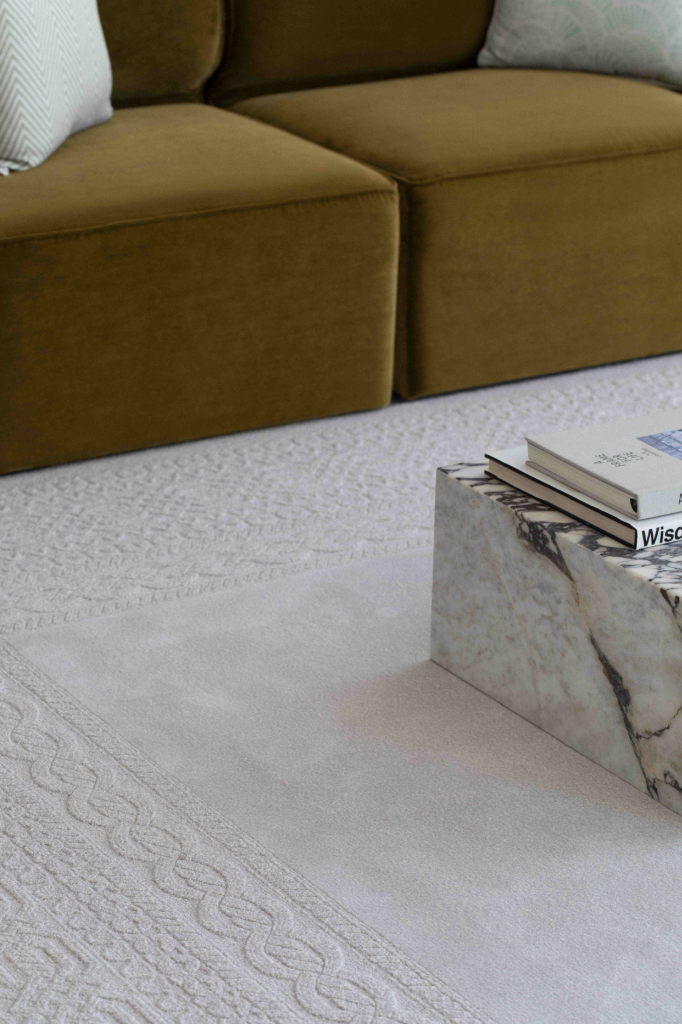 豪華舒適的長條形手工地氈,採用柔和灰調,靈感源自針織毛衣的精緻圖案。結合割絨和圈織紋理及不同絨毛高度,打造立體編織質感。