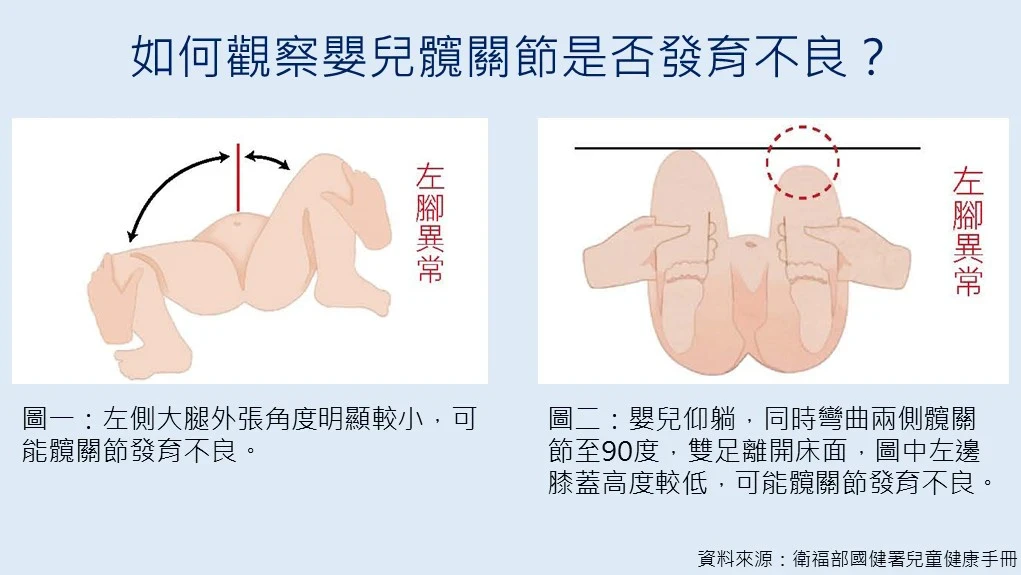 鄭士豪表示,雖然發展性髖關節不良的發生率不高,但若孩子髖部異常應及早就醫檢查。若是出生後3~6個月內的嬰兒,可由專科醫師透過觸診檢查髖關節的穩定性及是否脫位,若發現疑似異常,通常會進一步安排髖部超音波檢查。